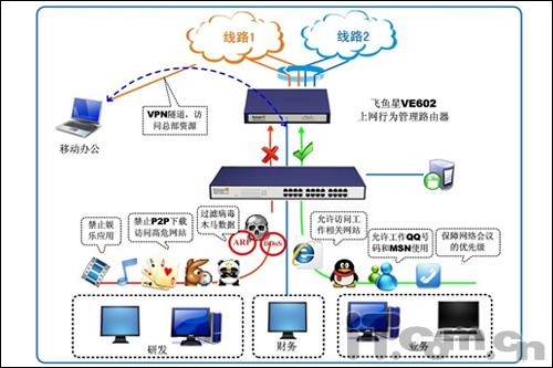 上班時(shí)間閑聊、游戲、團購……,嚴重影響工作效率。飛魚(yú)星VE602具有一體化的上網(wǎng)行為管理體系,從網(wǎng)址分類(lèi)管理、WEB安全管理、聊天軟件管控、P2P軟件管控、股票軟件管控、熱門(mén)游戲管控(例如QQ游戲、開(kāi)心農場(chǎng)、開(kāi)心網(wǎng)等)、分組分時(shí)段管控等進(jìn)行全方位的上網(wǎng)行為管理。幫助中小企業(yè)用戶(hù)在沒(méi)有專(zhuān)業(yè)網(wǎng)管的情況下,也能用好網(wǎng)絡(luò ),管好網(wǎng)絡(luò ),全面提升員工的工作效率。