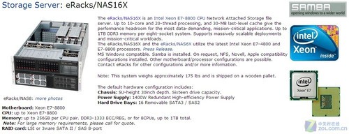根據介紹,最新推出的NAS服務(wù)器產(chǎn)品都采用了4-8顆至強E7系列處理器。在今年早些時(shí)候,英特爾曾推出兩款至強E7-4800系列(支持最高 四路處理器系統)和E7-8800系列(支持最高8路處理器系統),它們都以Westmere-EX代號進(jìn)行命名。最新處理器擁有1567個(gè)針腳,單個(gè)處理器擁有最高10個(gè)內核(總共20個(gè)線(xiàn)程)和30MB緩存。