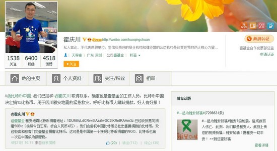 昨日下午,霍慶川在微博上宣布,壹基金已經(jīng)收到意向捐贈50Btc(按照當日匯率,折合人民幣4萬(wàn)元)并將委托中國比特幣公社出售募捐到的比特幣,同時(shí)歡迎極客和駭客們向壹基金捐贈比特幣。之后,比特幣中國宣布,決定向壹基金捐贈15比特幣,用于四川雅安地震的緊急救災。