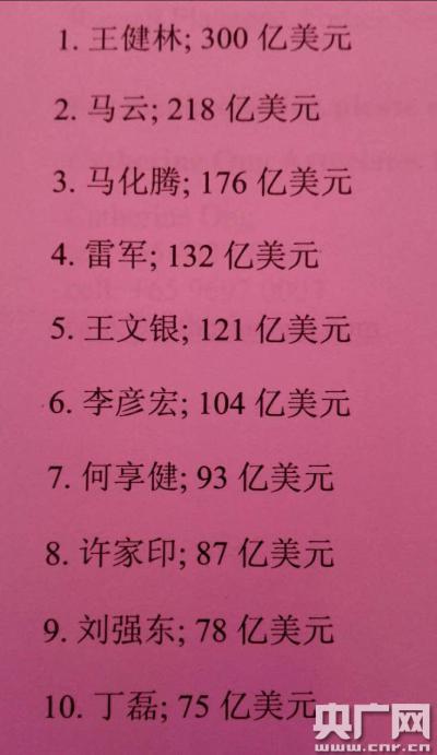 26日,《福布斯》雜志在京發(fā)布2015年福布斯中國富豪榜,萬(wàn)達集團董事長(cháng)王健林勝過(guò)馬云,重回首富寶座 馬云由第一位跌至第二位,馬化騰則繼續維持第三位。前十位有6位來(lái)自互聯(lián)網(wǎng)行業(yè)。2015年福布斯中國富豪榜上前100名成員的財富總和從一年前的3760億美元增至4500億美元,增幅近20%。